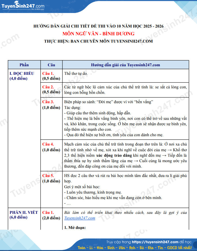 Đề và đáp án môn ngữ văn thi lớp 10 năm 2025 tỉnh Bình Dương