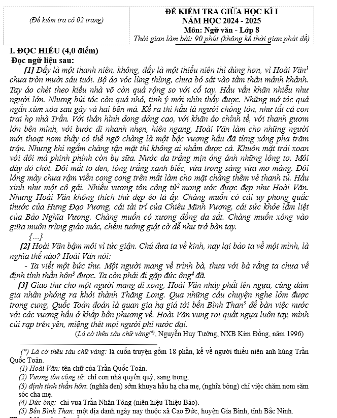 KIỂM TRA GIỮA HỌC KÌ I NĂM HỌC 2024 – 2025 Môn: Ngữ văn – Lớp 8 |