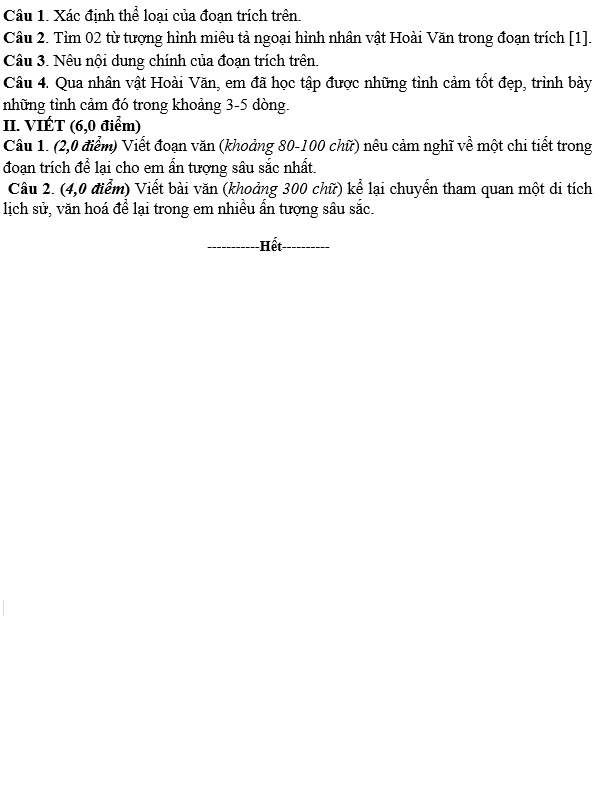 | 2 | Học sinh chỉ đúng 02 các từ ngữ miêu tả ngoại hình của Hoài Văn đạt điểm tối đa.