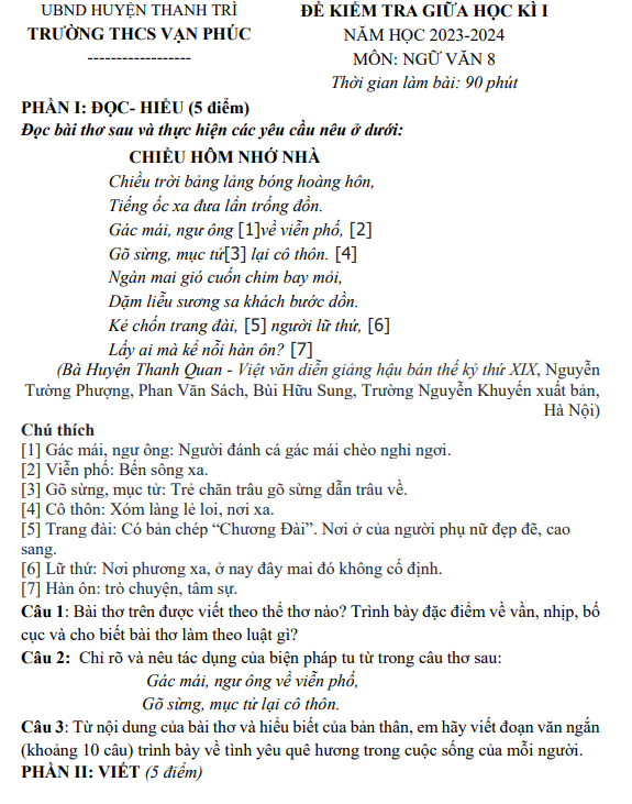 ĐỀ KIỂM TRA GIỮA HỌC KÌ I VĂN 8 THCS VẠN PHÚC NĂM 2023 2024