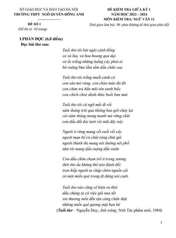 ĐỀ KIỂM TRA GIỮA KÌ I VĂN 11 THPT NGÔ QUYỀN 2024 2025