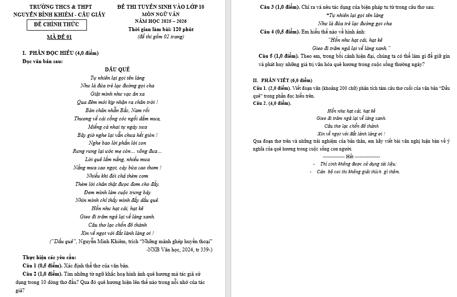 MÔN NGỮ VĂN NĂM HỌC 2025 – 2026 Thời gian làm bài: 120 phút (đề thi gồm 02 trang) |