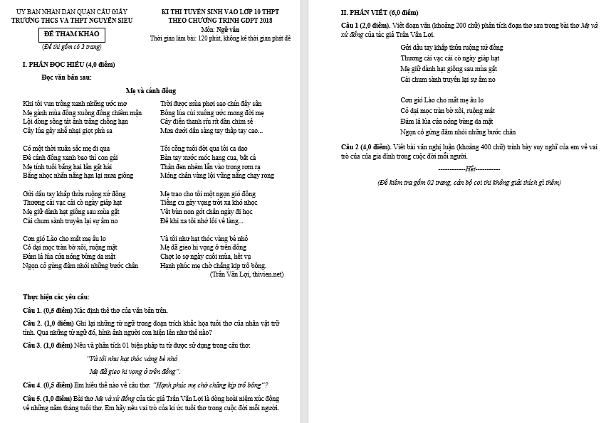 Câu 1 (2,0 điểm). Viết đoạn văn (khoảng 200 chữ) phân tích đoạn thơ sau trong bài thơ Mẹ và xứ đồng của tác giả Trần Văn Lợi.