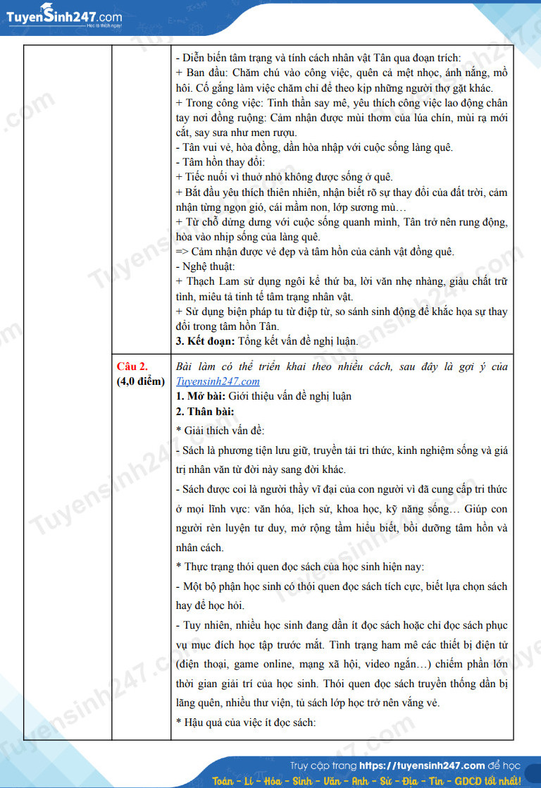 Câu 2 (4,0 điểm). Sách là người thầy vĩ đại của con người. Tuy nhiên, xã hội hiện đại với sự phát triển của nhiều hình thức giải trí đã khiến cho một bộ phận học sinh ít đọc sách, thậm chí thờ ơ, dửng dưng với sách. Hãy viết một bài văn (khoảng 500 chữ) trình bày suy nghĩ của em về vấn đề trên và đề xuất một số giải pháp để học sinh thay đổi thói quen đọc sách.