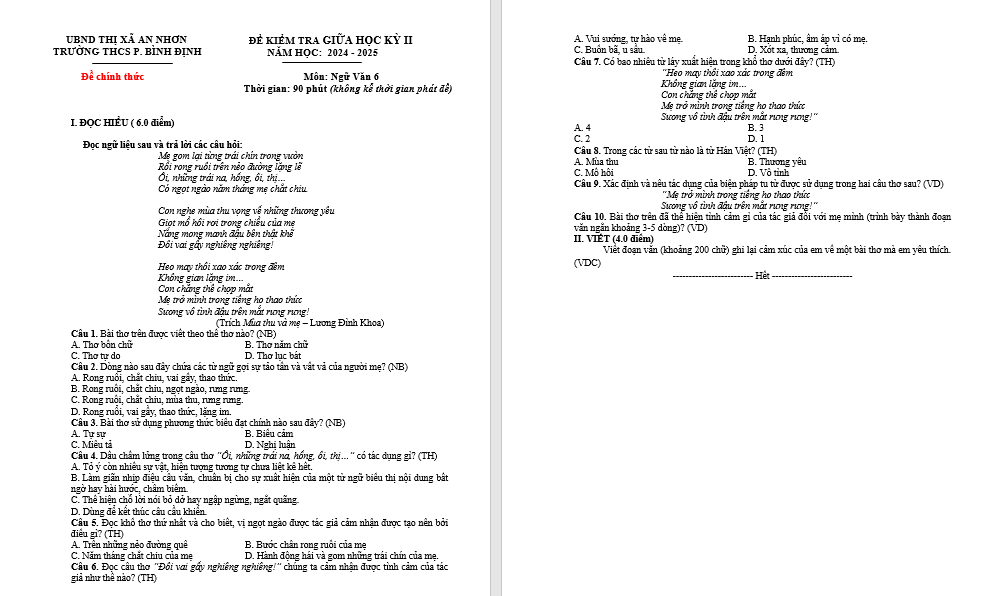 | Đề chính thức | Môn: Ngữ Văn 6