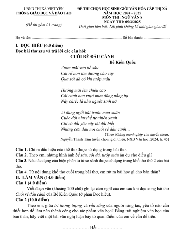 MÔN THI: NGỮ VĂN 8 (Thân Nhân Trung) NGÀY THI: 05/3/2025 |