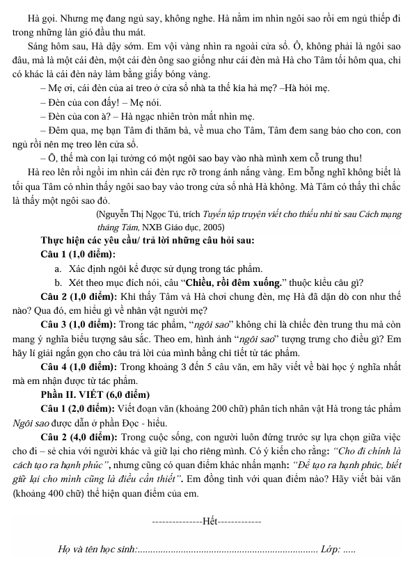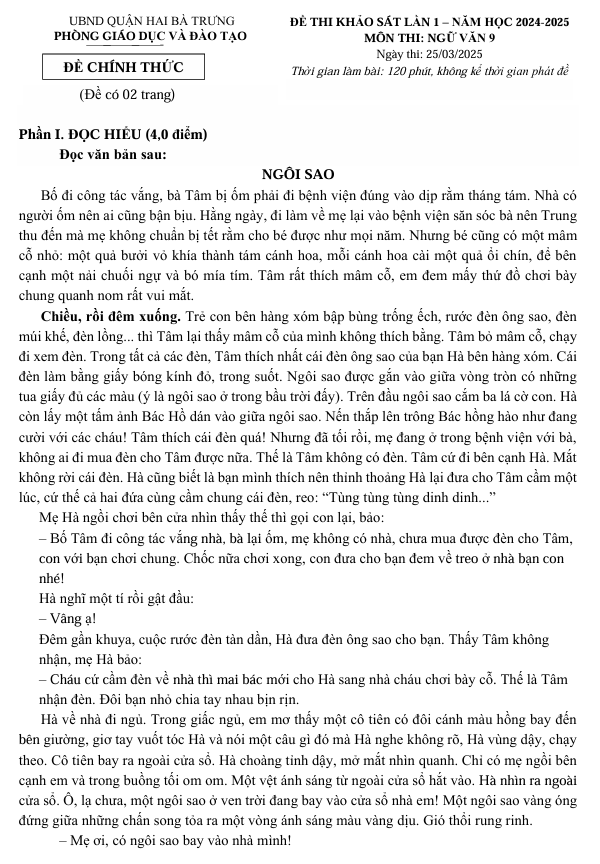 ĐỀ THI KHẢO SÁT LẦN 1 VĂN 9 NĂM HỌC 2024-2025 QUẬN HAI BÀ TRƯNG