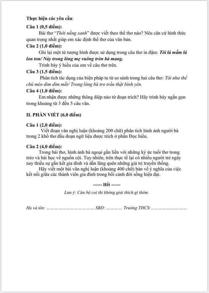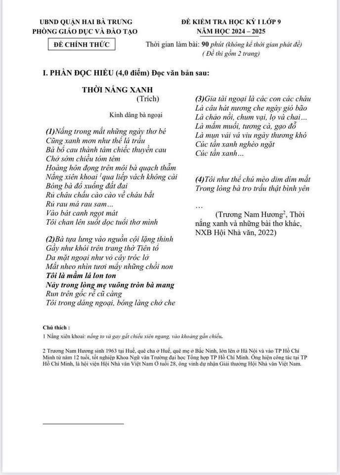 ĐỀ THI NGỮ VĂN LỚP 9 HỌC KỲ I QUẬN HAI BÀ TRƯNG NĂM HỌC 2024 – 2025 (KÈM HƯỚNG DẪN CHẤM)