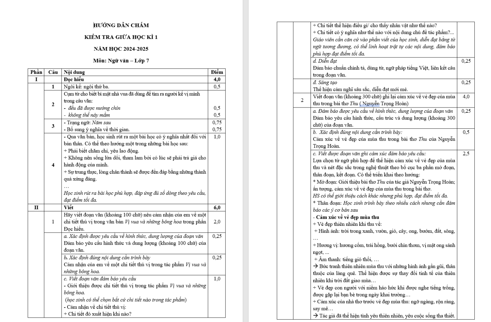 ĐÁP ÁN MÔN NGỮ VĂN KIỂM TRA GIỮA KÌ 1 LỚP 7 2024 – 2025 TRƯỜNG THCS TỪ SƠN