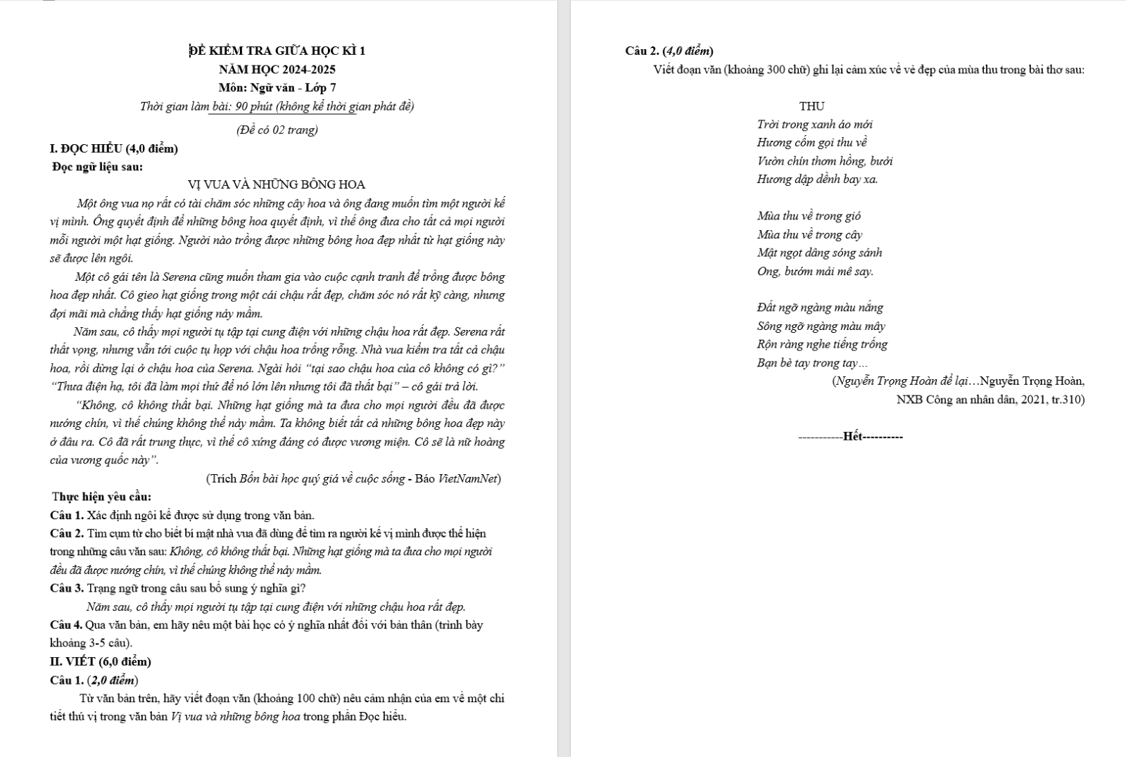 ĐỀMÔN NGỮ VĂN KIỂM TRA GIỮA KÌ 1 LỚP 7 2024 – 2025 TRƯỜNG THCS TỪ SƠN