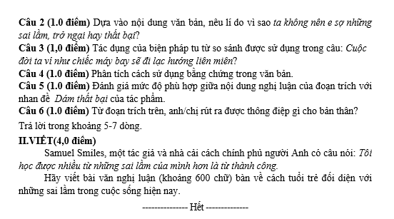 * Phần viết (4,0 điểm): Viết văn bản nghị luận về một vấn đề liên quan đến tuổi trẻ (những hoài bão, ước mơ)