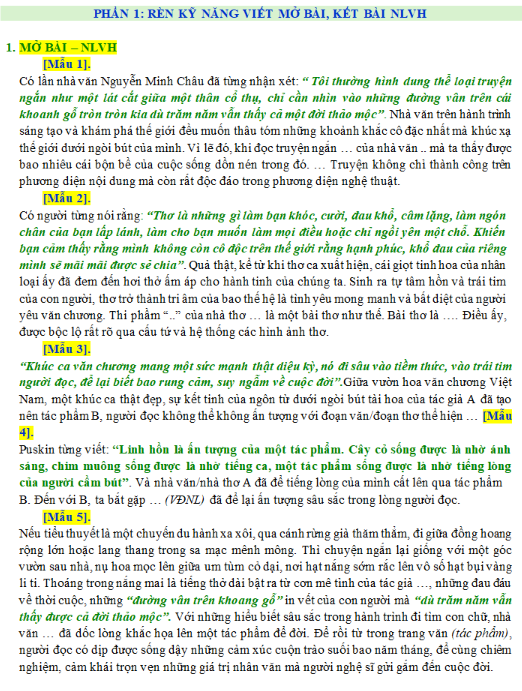 - Gồm hơn 40 mẫu mở bài – kết bài cho cả hai dạng: nghị luận văn học và nghị luận xã hội.