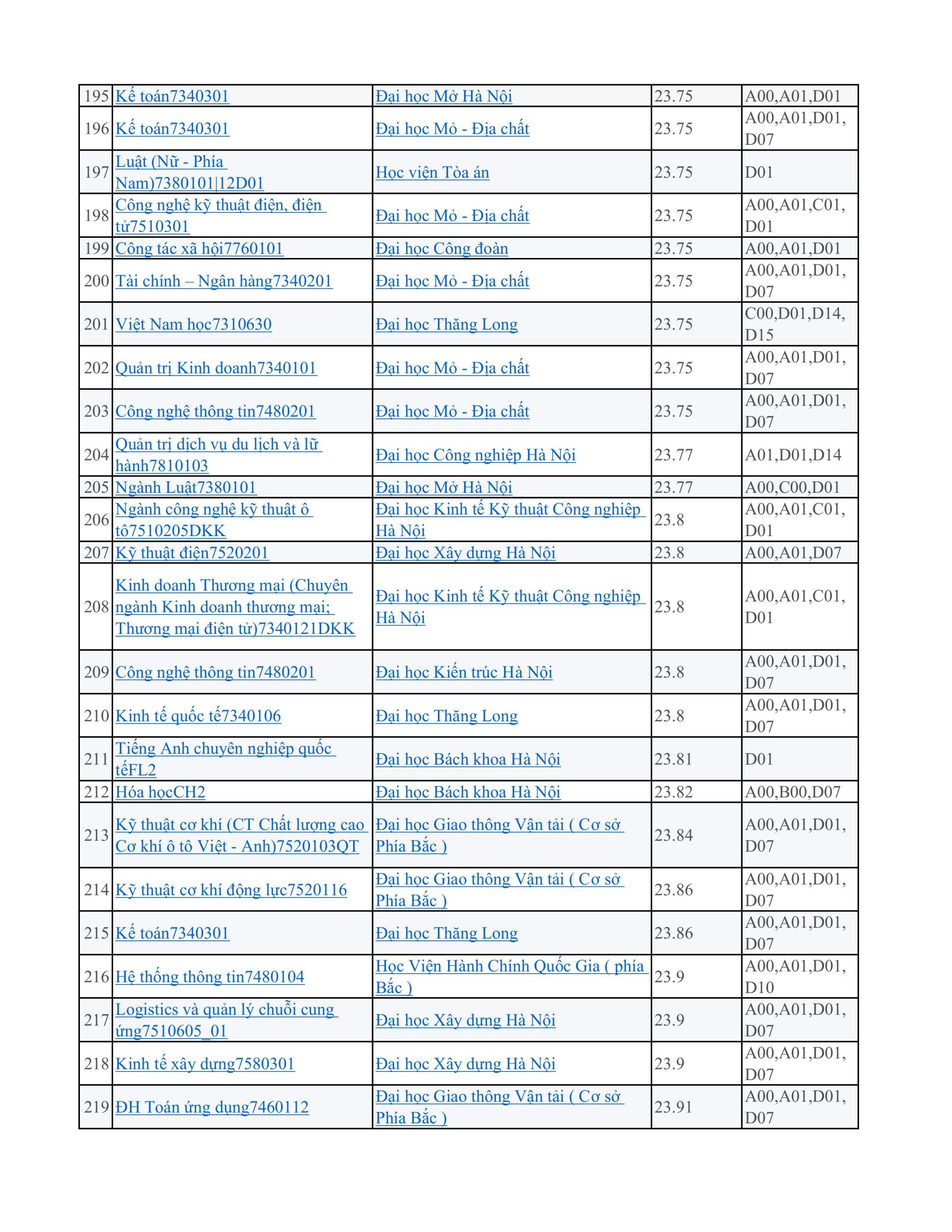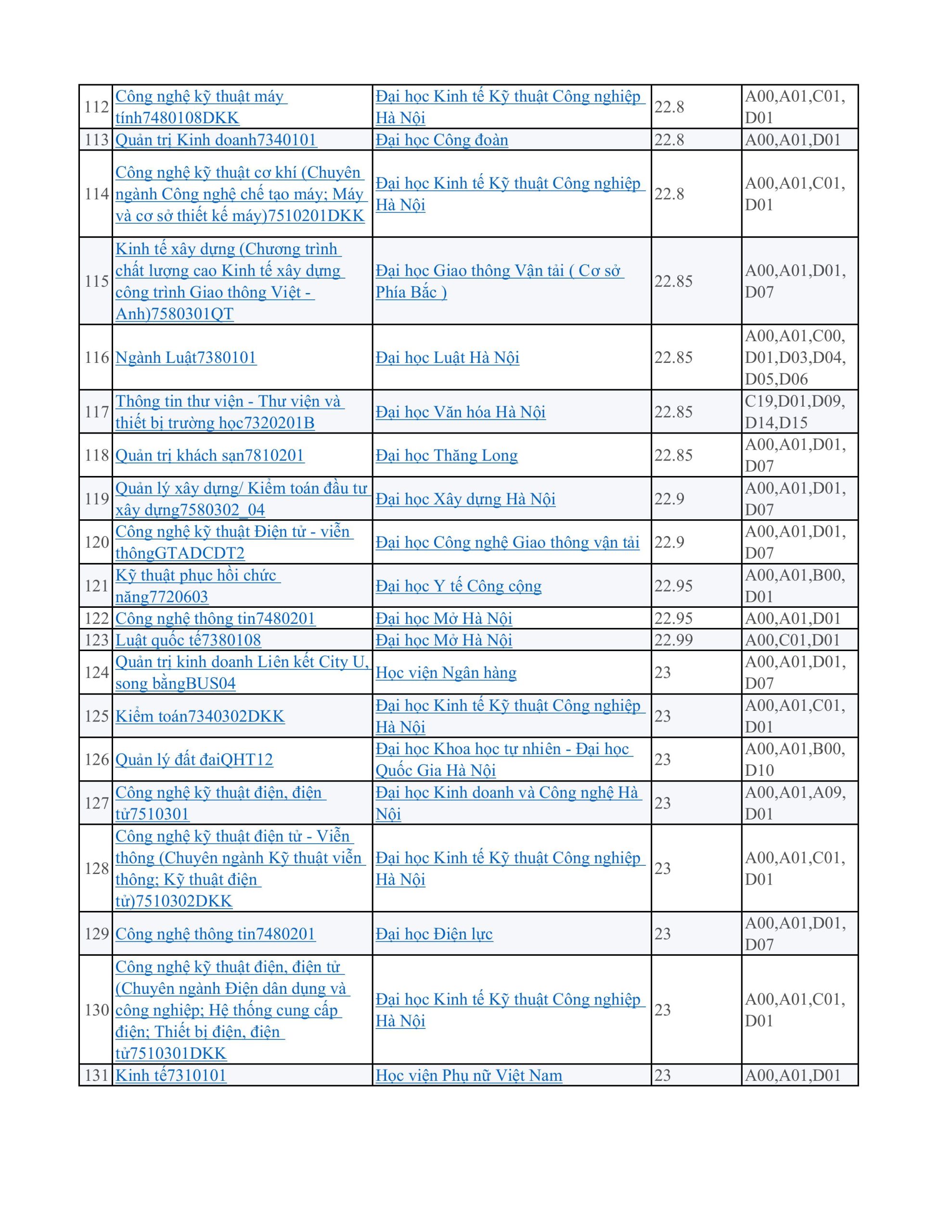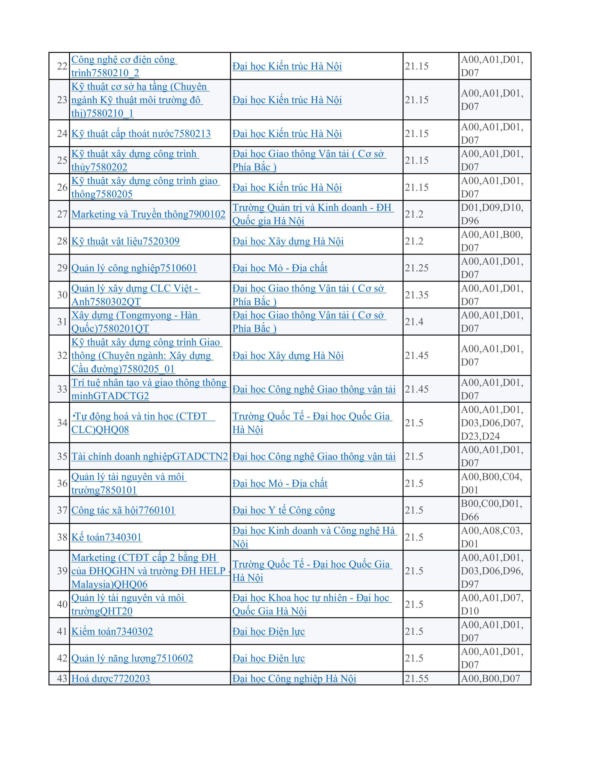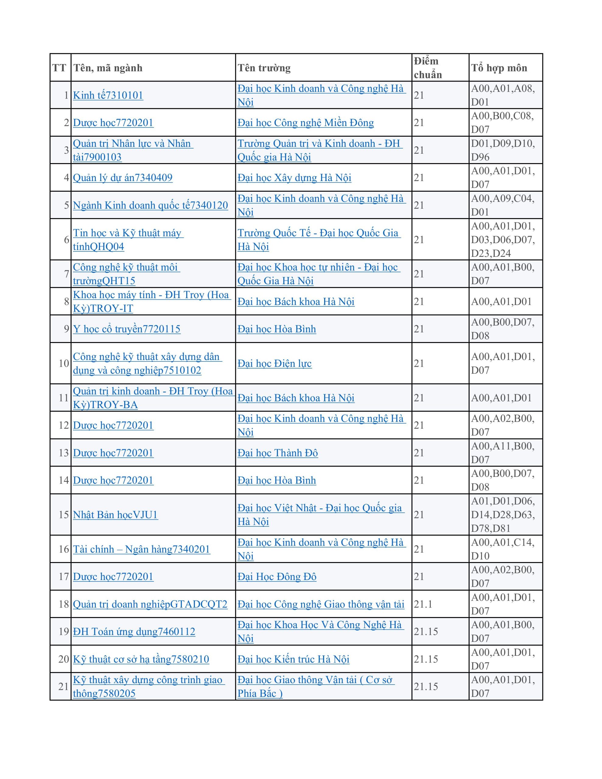 Danh sách các trường có điểm chuẩn từ 21 đến 24 điểm khối D năm 2024 ở Hà Nội