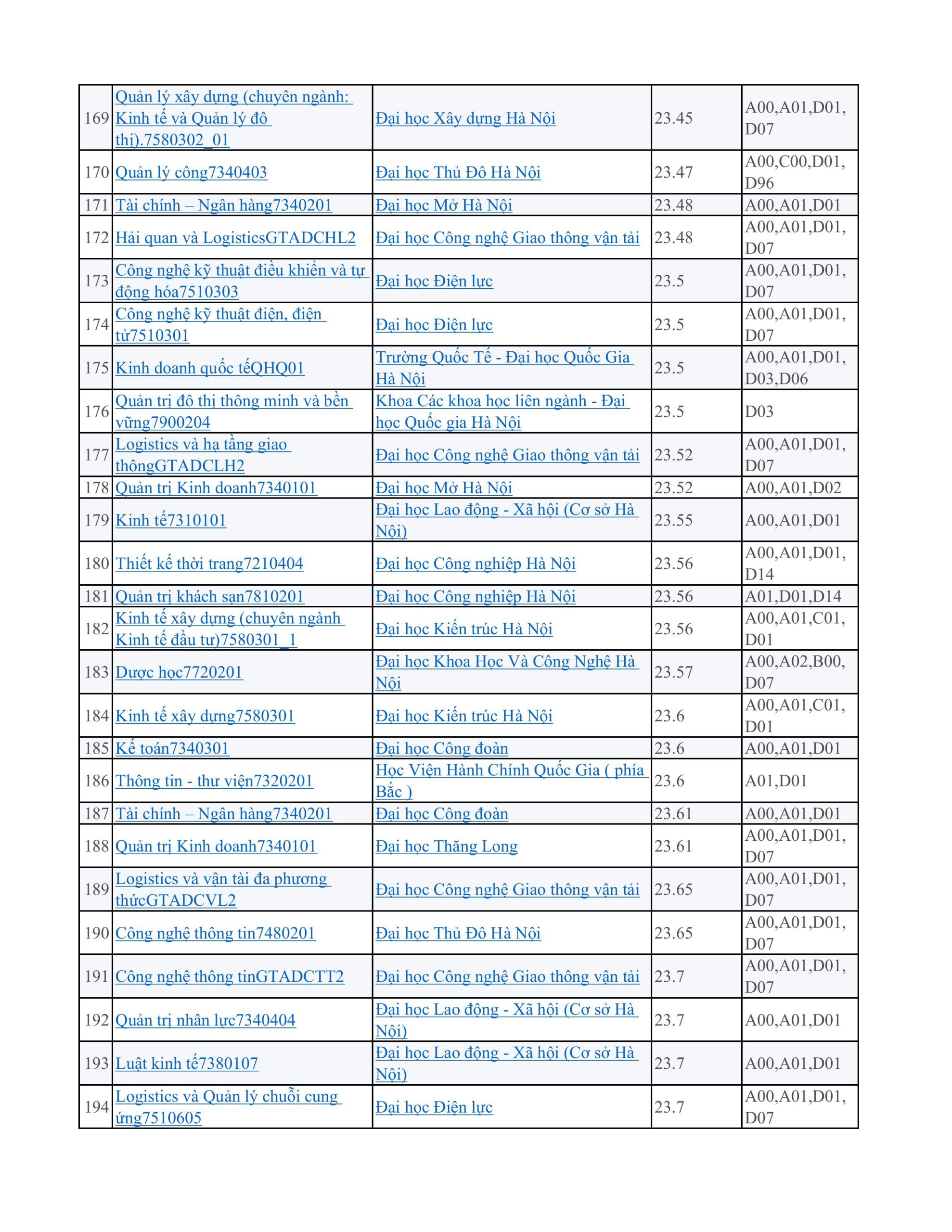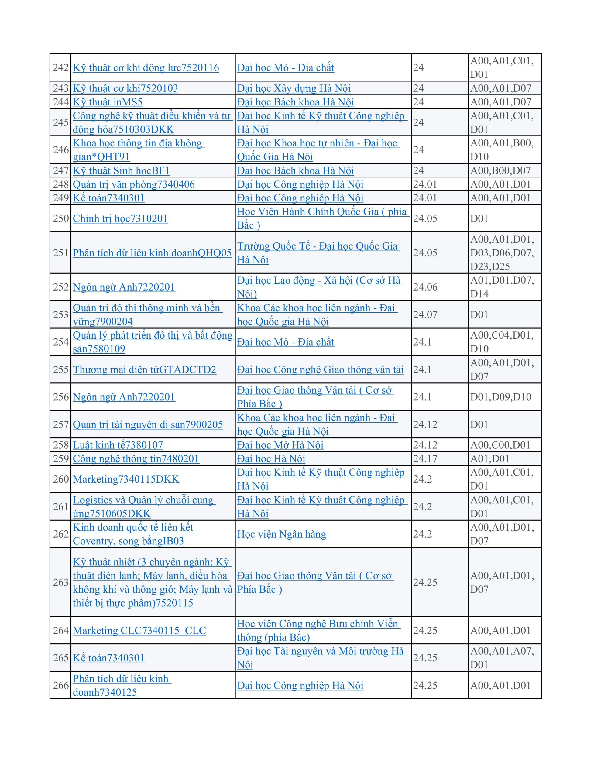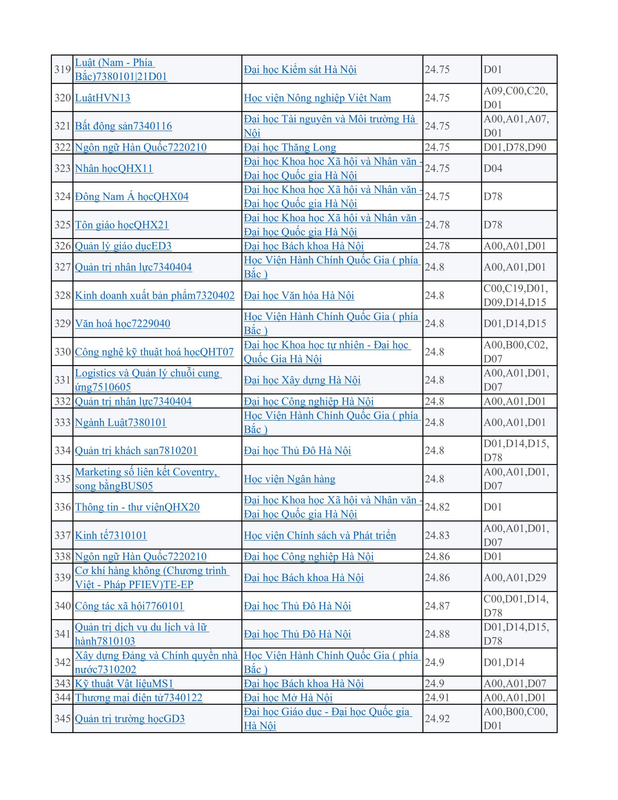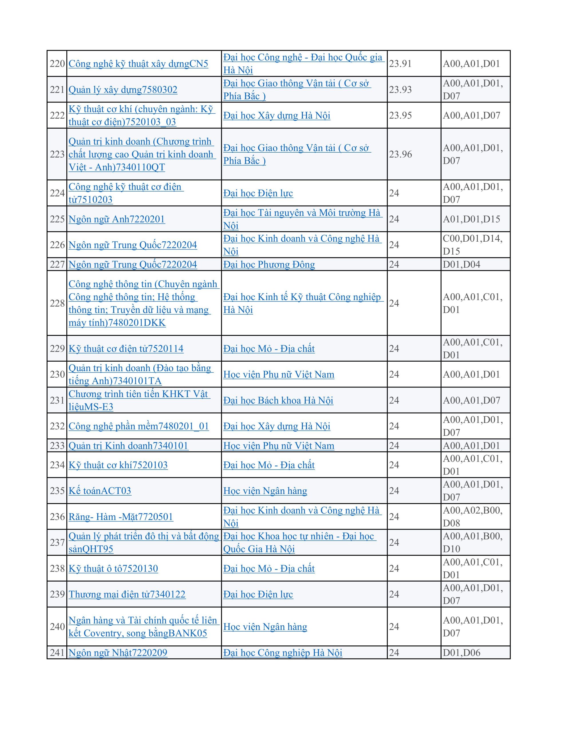 Danh sách các trường có điểm chuẩn từ 21 đến 24 điểm khối D năm 2024 ở Hà Nội